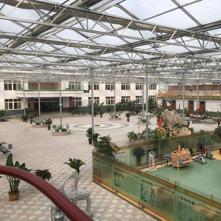 玻璃阳光版温室是比较高端的温室形式,主体温室骨架使用更大的镀锌钢材,四周覆盖中空玻璃,顶部覆盖玻璃或者阳光板,一般常见的形式为连续的小尖顶。温室内部配有内外遮阳系统、水帘风机、内保温、顶开窗系统,以及加温降温的设备。可以配套物联网系统,时时远程监控温室内的环境。这种温室造价比较高,但是使用寿命长,节省人工,综合经济效益好,是现代农业发展的重要温室形式。